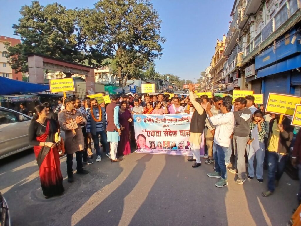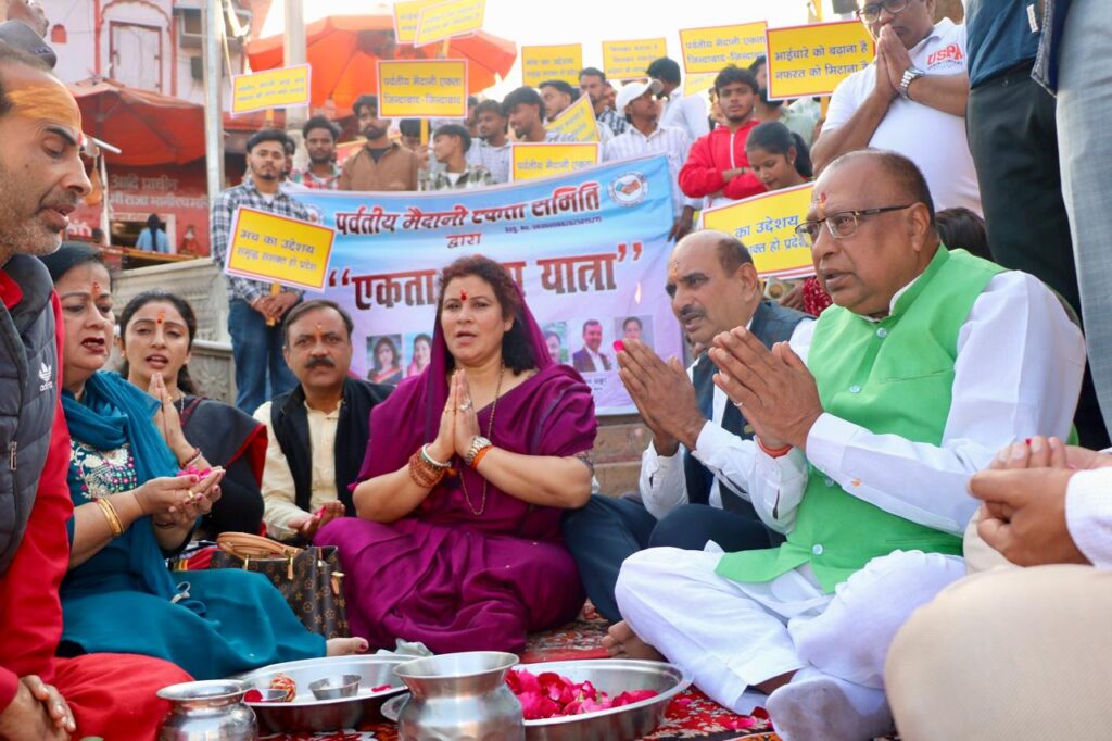 हरिद्वार (संसार वाणी) र्वतीय मैदानी एकता मंच ने हर की पौड़ी पर गंगा पूजन कर मां गंगा से आशीर्वाद लेकर हर की पौड़ी से ललतारा पुल सिंह सभा गुरुद्वारे तक एक विशाल जनजागरुक रैली का आयोजन किया जिसमें सैकड़ों लोगों ने अपना योगदान दिया और …………पर्वतीय मैदानी एकता जिंदाबाद…….…….. ………हमारा इरादा नेक है उत्तराखण्ड एक है……… …..भाईचारे को बढ़ाना है नफरत को मिटाना है…….. ऐसे कई नारों के साथ हरिद्वार गूंज उठा पर्वतीय मैदानी एकता मंच के राष्ट्रीय अध्यक्ष पीके अग्रवाल ने बताया कि हमारी रैली का उद्देश्य एकता को बढ़ावा देना और लोगों को जागरूक करना है जो आजकल कुछ चंद लोगों के द्वारा समाज को बहकाने का काम किया जा रहा है। उन बुराइयों को दूर करने और उन लोगों की मानसिकता को ठीक करने की हमारी ये पहल है लेकिन ये तो अभी शुरूआत है। आगे भी हमारे द्वारा ऐसे कई कदम